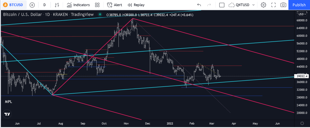 First I’d like to say that I’m not much of a fundamental guy, I really don’t know what fundamental news actually moves the markets nor do I really used fundamental news to make trades. There are exceptions such as news coming out that certain coins are frauds or that circumstantial evidence shows that a rug pull is likely. I wouldn’t invest or trade in such coins most likely. Having said that I still like to make my quips on the market but I primarily deal with what I see on the charts. BTC USD’s chart looks like it’s indecisive as to which direction it wants to head. For the moment we’re seeing price unable break $44,400 and not only hold then but break through with any gusto. Very strong sellers at and above this area. Every retest and reversal from the uplsoping blue lower parallel line tries to swing back up to the roughly $44,400 but it just can’t really break through. We aren’t really make lower lows either. The market is clearly indecisive about where to go and in times like these I just sit back and wait to see what the next few days bring. Oh and this is a daily chart of BTC USD via Kraken. Looking at the down sloping magenta median line you can see that it accurately captures bounced off the middle line pretty well however any subsequent pushes from it do not lead to higher highs. Price just bounces off and tries to go higher but fizzles and new lower lows are made. If price does decide to retest the middle magenta parallel line, we could be looking at $35,500 or even lower to where bigger whales may still be waiting with buy orders. If we break the $33,100 area (roughly) with any strong strength to the downside then I do expect a retest of $29,000 area. Could be whales there with bags ready to stock upon BTC or they may pull their orders to see where the market goes. Most likely they may try to wash out traders with poor stops below the $29,000 area before scooping up BTC wholesale or they may lead it sink further. You have to wait to see what the big boys and girls do and then ride their coattails. Don’t pick up nickles and dimes on train tracks if you hear the choo choo train approaching. Let’s wait and see what the market gifts us in the next few days and weeks. Wishing you all prudent trading.